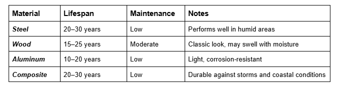 Charleston’s coastal environment can affect materials differently. Salt air, humidity, and occasional storms mean some doors perform better than others over time.